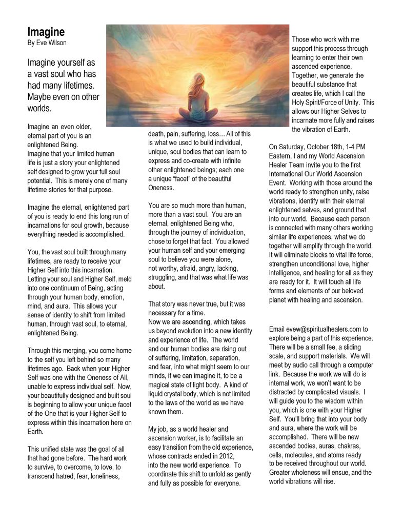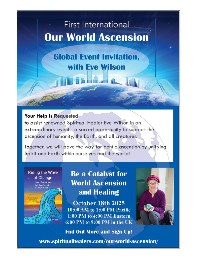 Body Mind Spirit Guide Magazine proudly sponsors the first “Our World Ascension” with Eve Wilson—renowned healer, author, and visionary. With nearly 40 years of experience, Eve’s transformative work spans individuals, families, pets, and the planet. Join us for a powerful journey of healing, spiritual growth, and planetary ascension.